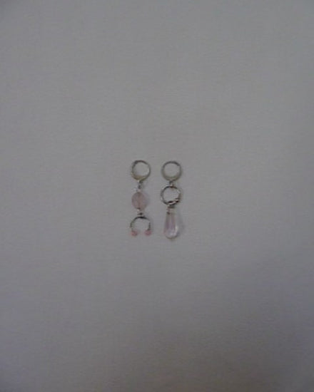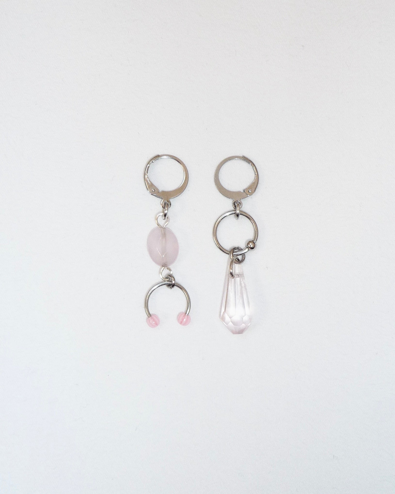 The "Blushing" Earrings are handmade using upcycled materials. These earrings feature upcycled stainless steel piercing jewellery, rose quarts crystal beads finished with stainless steel huggie clasps.