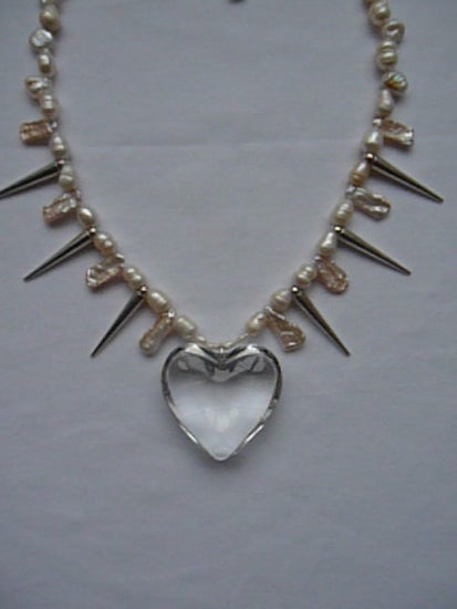 The "Speared" Necklace is handmade using upcycled materials. This necklace features upcycled freshwater pearls, silver spears and glass heart pendant, finished with stainless steel.