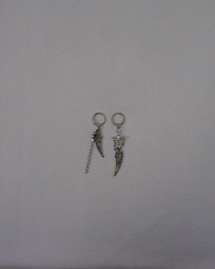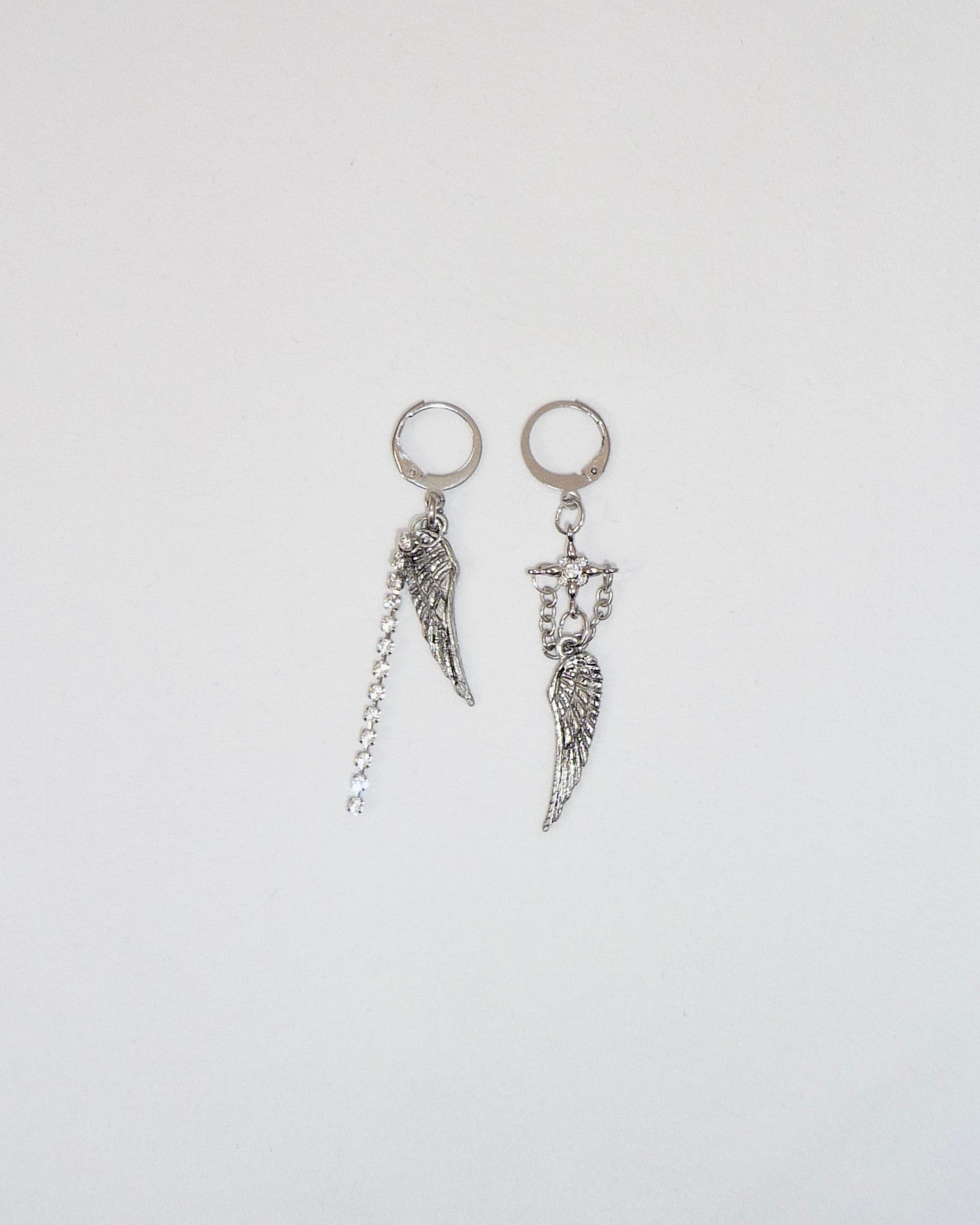 The "Angelic" Earrings are handmade using upcycled materials. These earrings feature upcycyled angel wing charms, rhinestone chains finished with stainless steel huggie clasps.