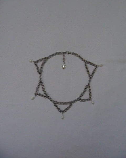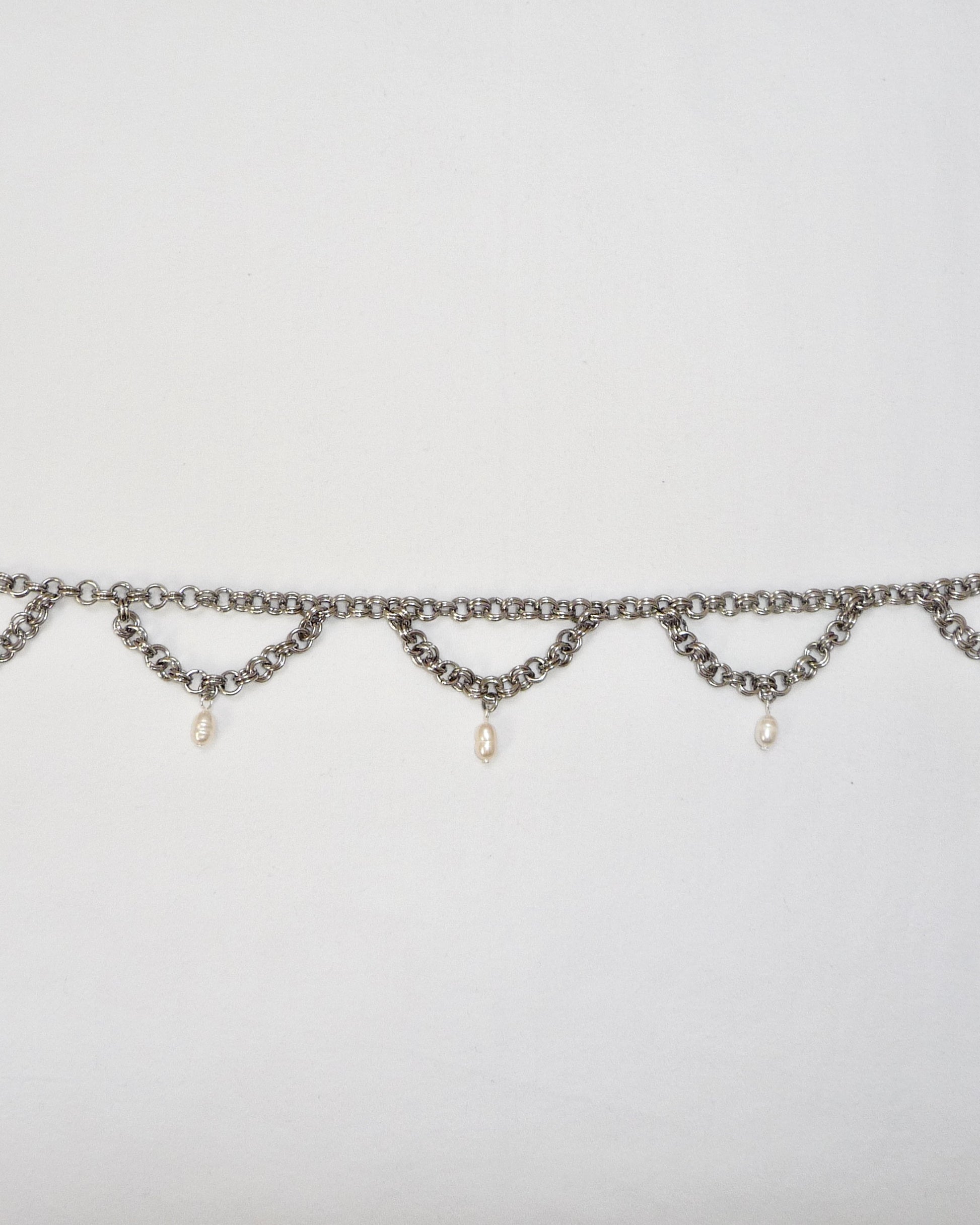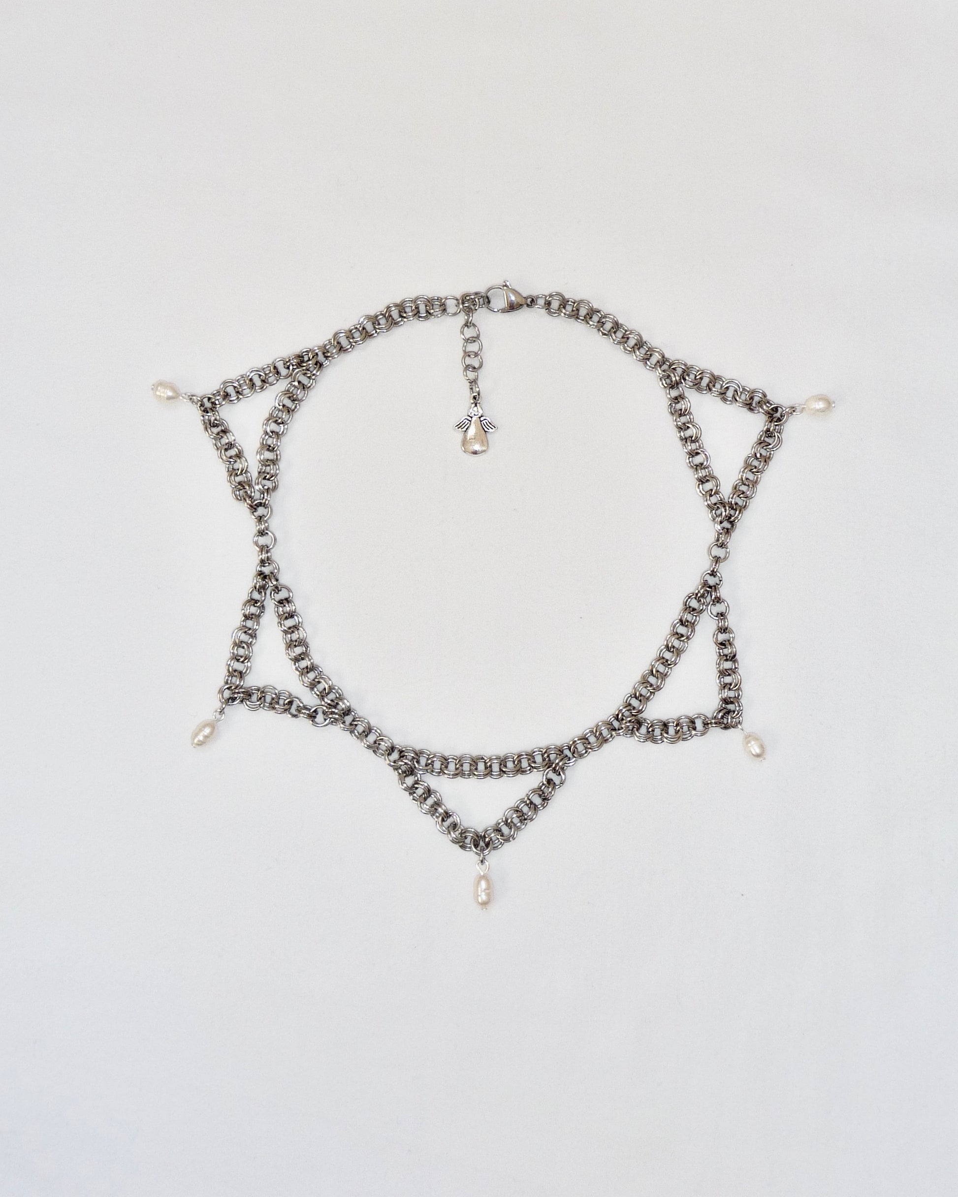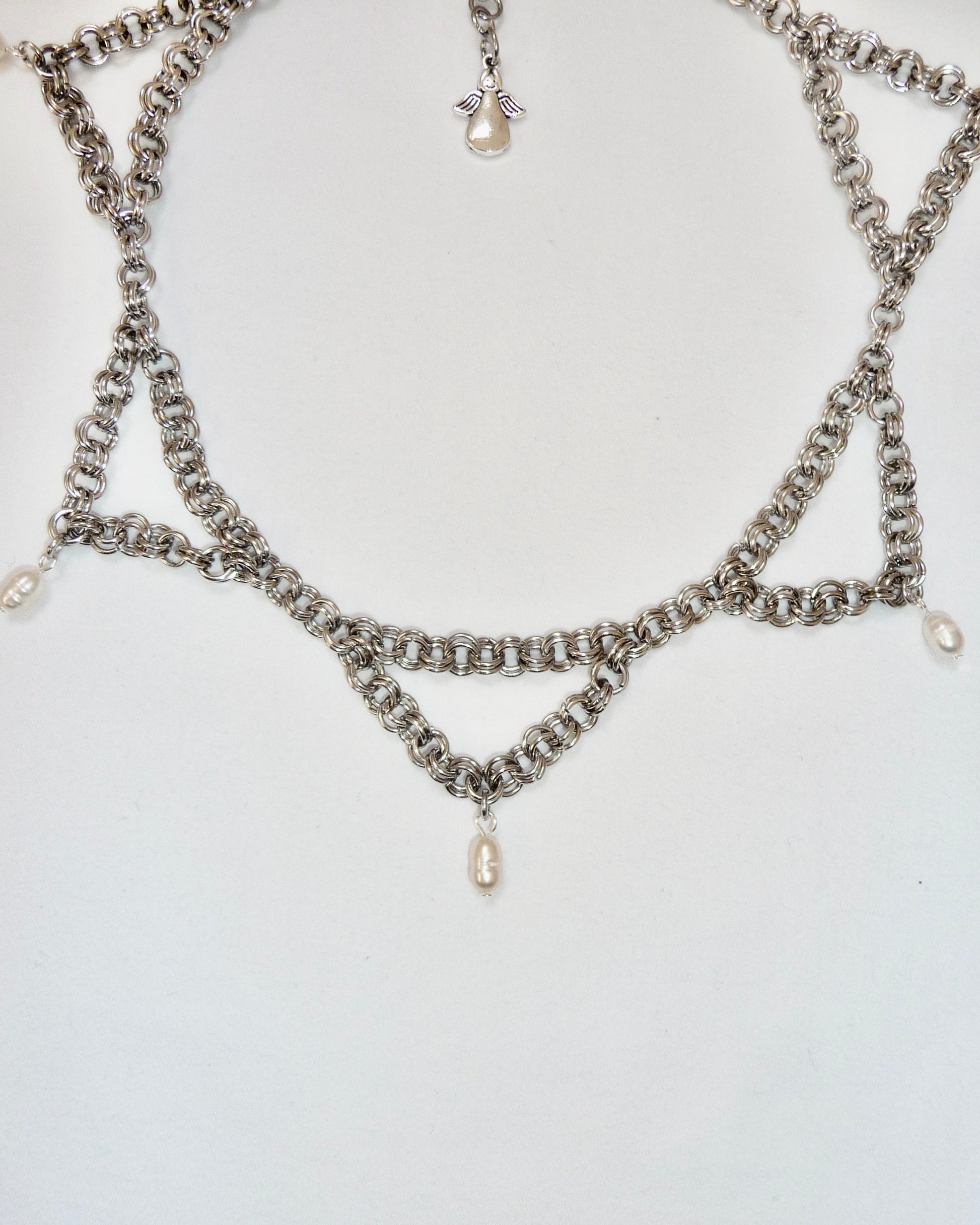 The "Collar" Necklace is handmade using surplus stainless steel jump rings and upcycled freshwater pearls. This is a shorter necklace that can be more of a choker or relaxed short necklace - depending on length of chain used.