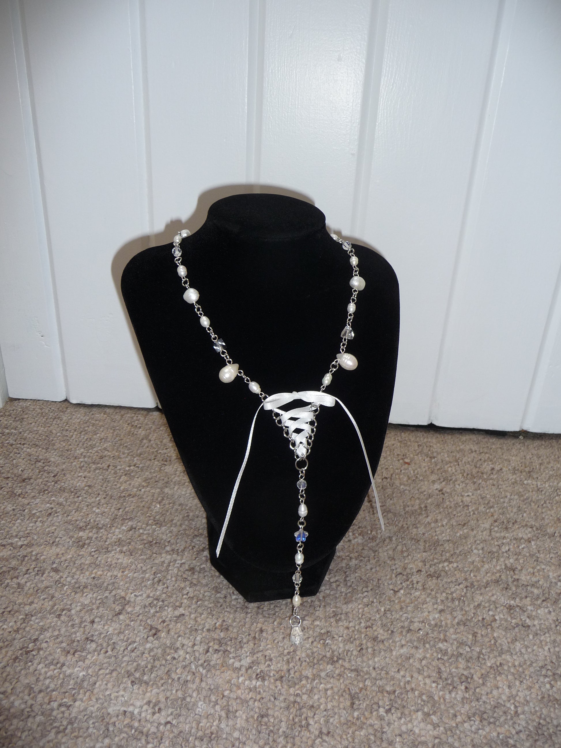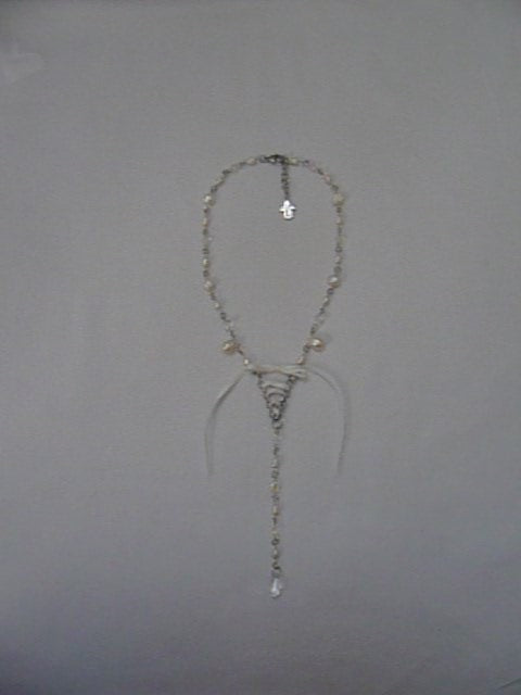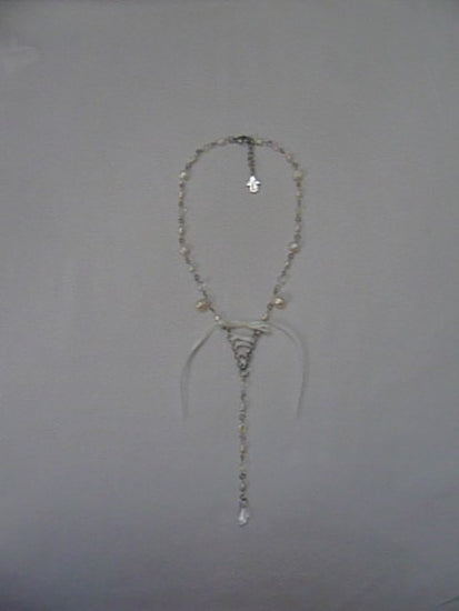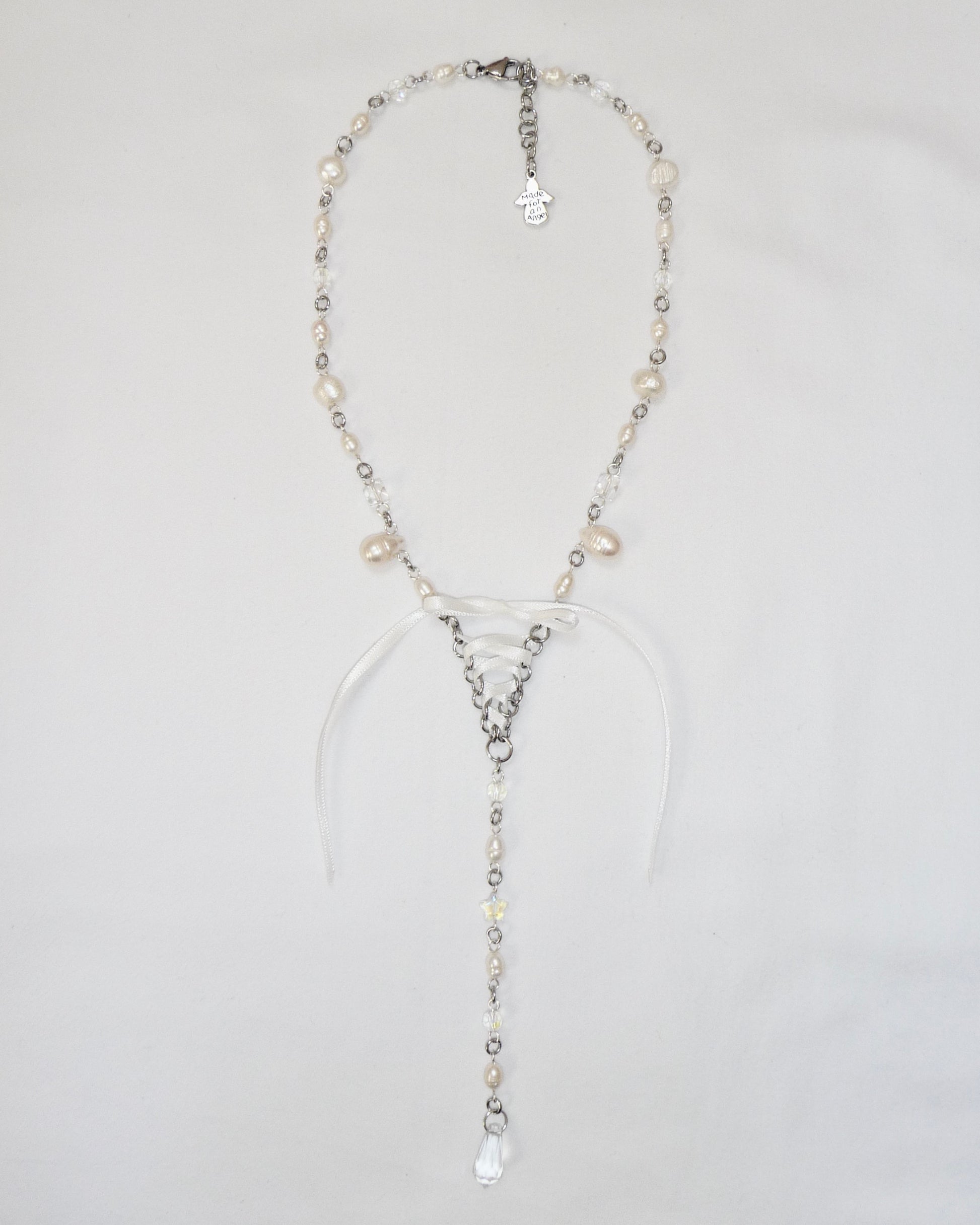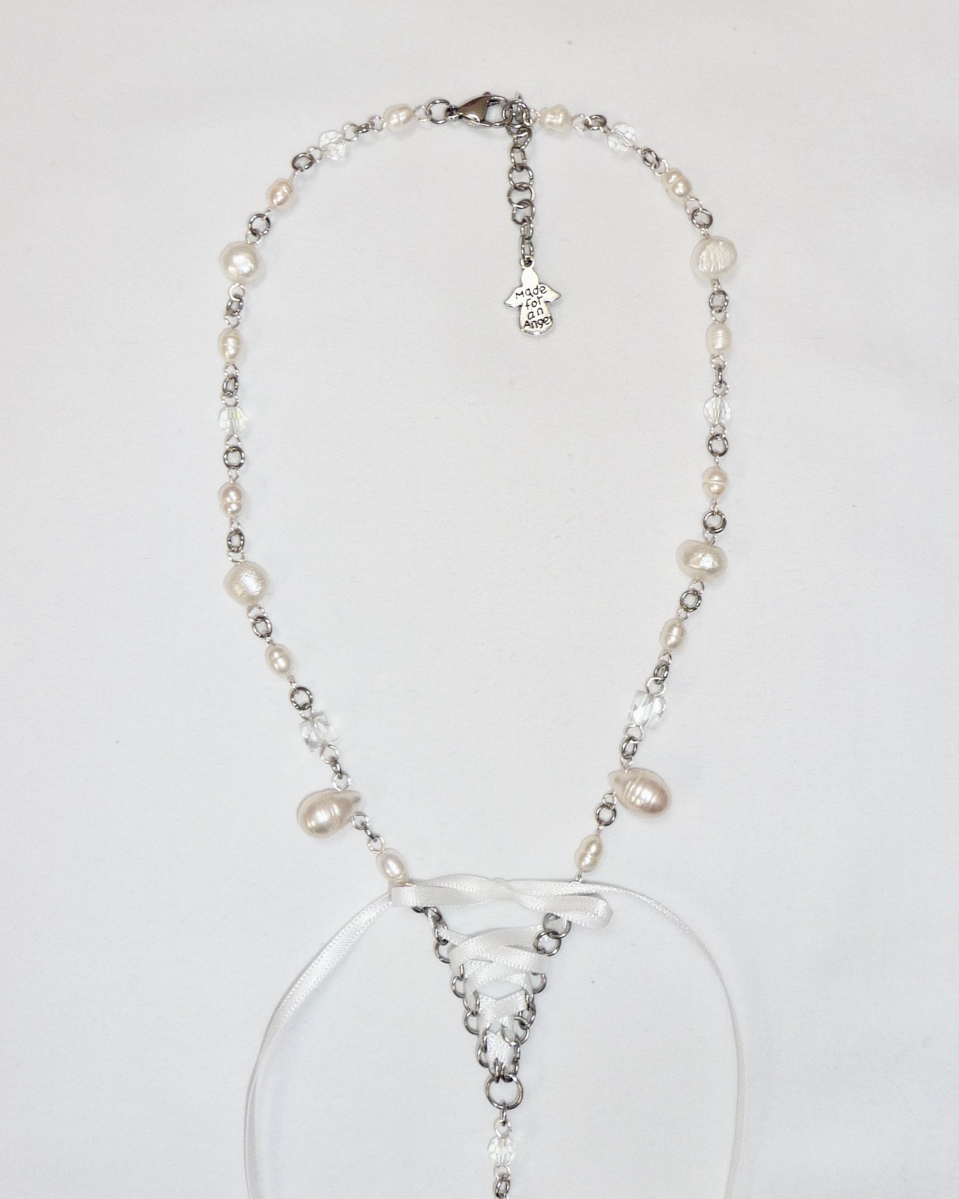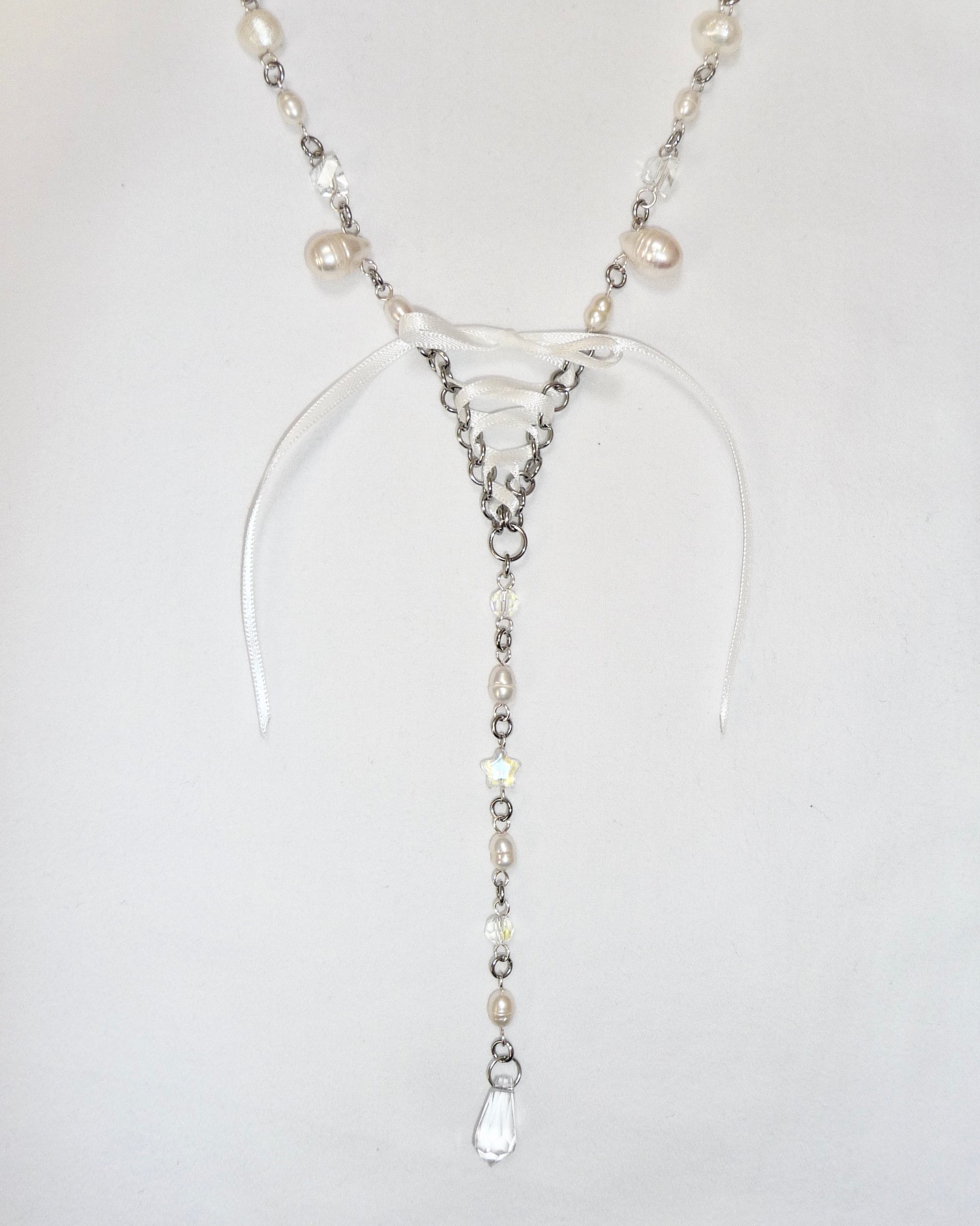 The "Coreseted" Rosary style Necklace is handmade using upcycled materials. This necklace features upcycled freshwater pearls, Czech glass beads, crystal charms and finished with stainless steel.