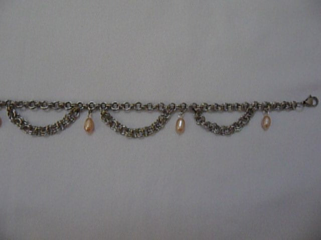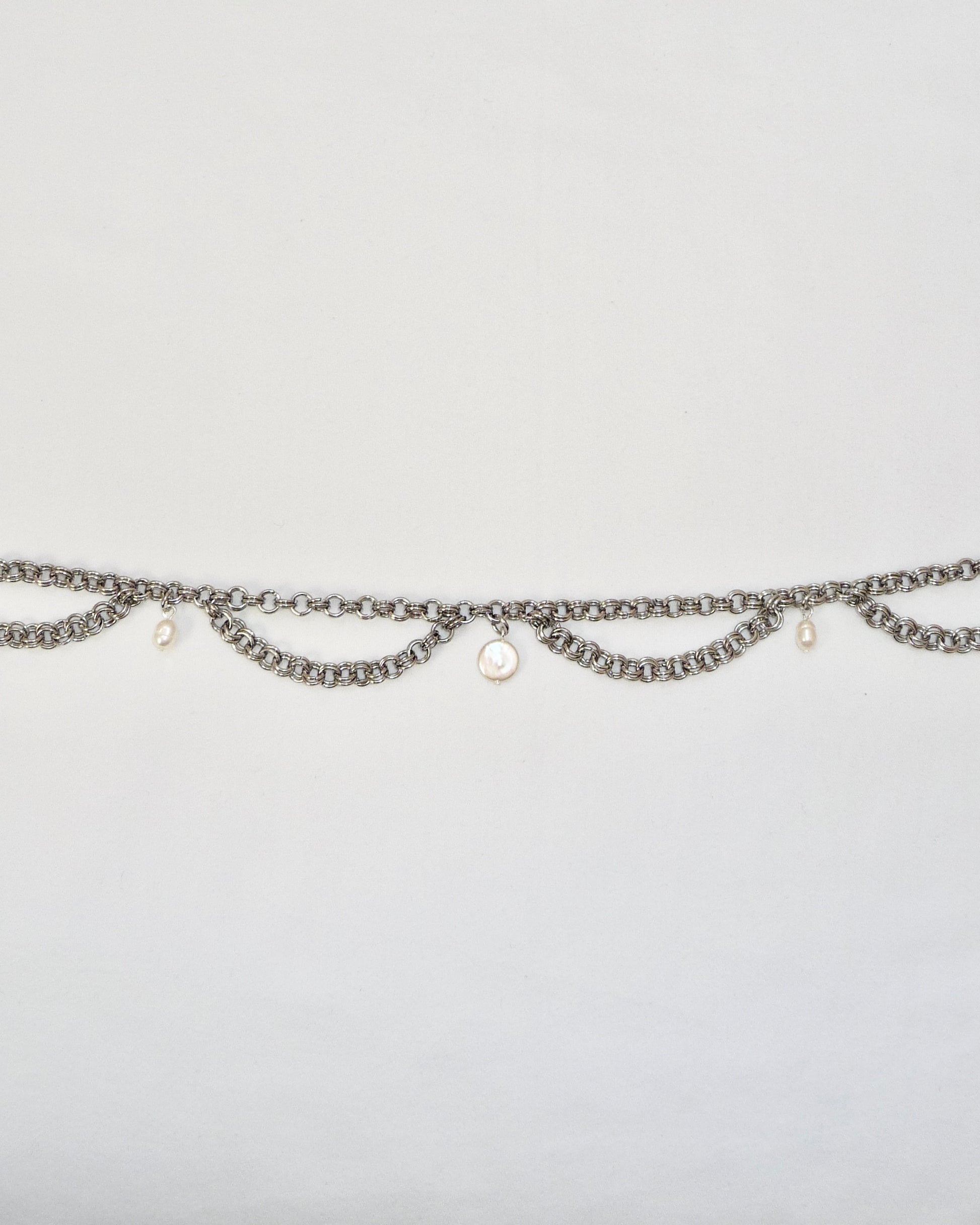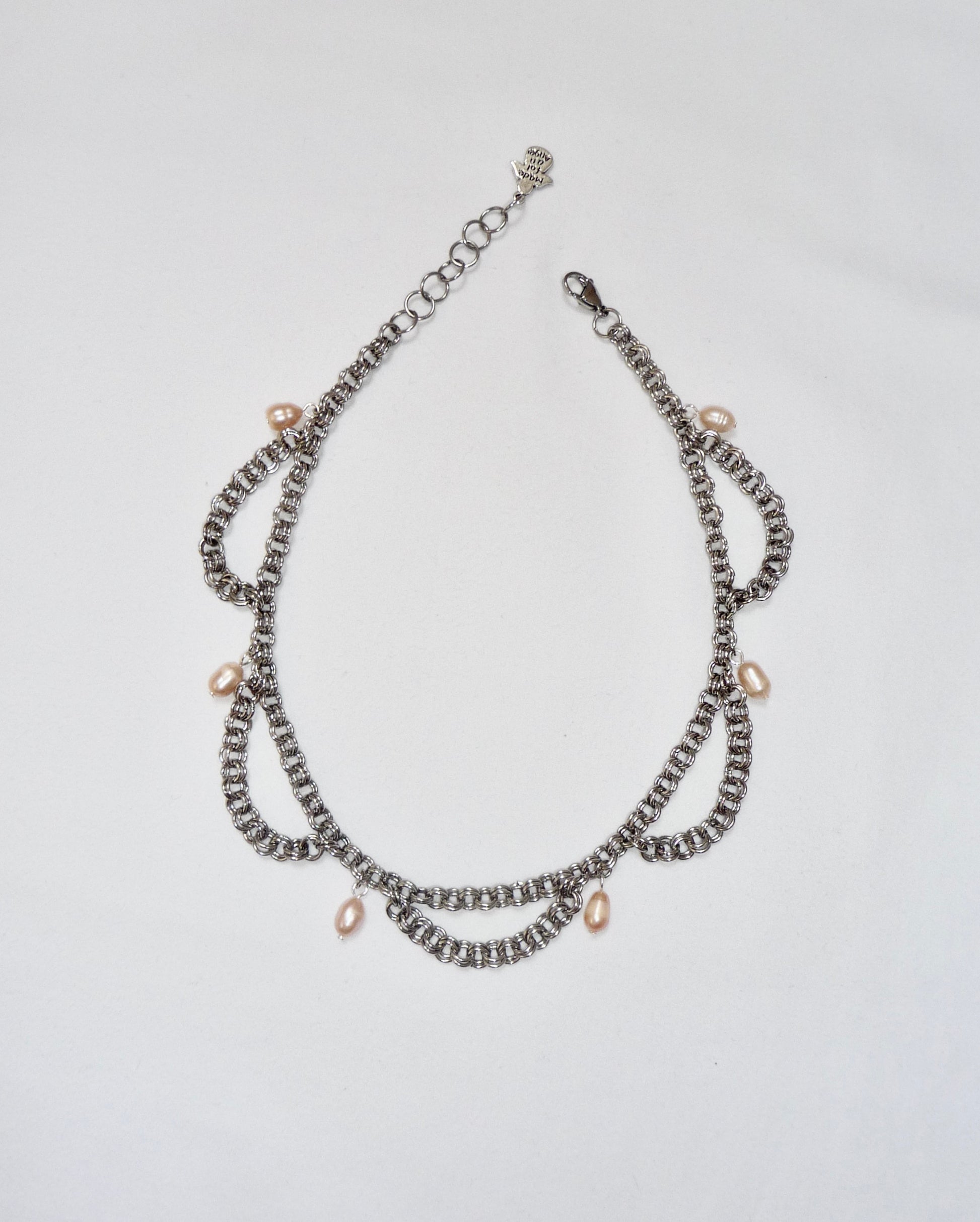 The "Fouette" Necklace is handmade using surplus stainless steel jump rings and upcycled freshwater pearls. This is a shorter necklace that can be more of a choker or relaxed short necklace - depending on length of chain used.