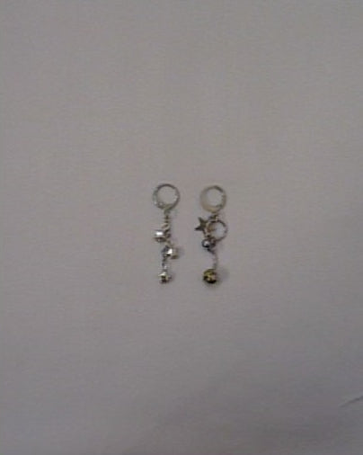 The "Starring" Earrings are handmade using upcycled materials. These earrings feature upcycled piercing jewellery, charms finished with stainless steel huggie clasps.