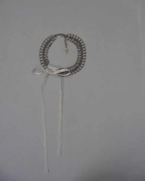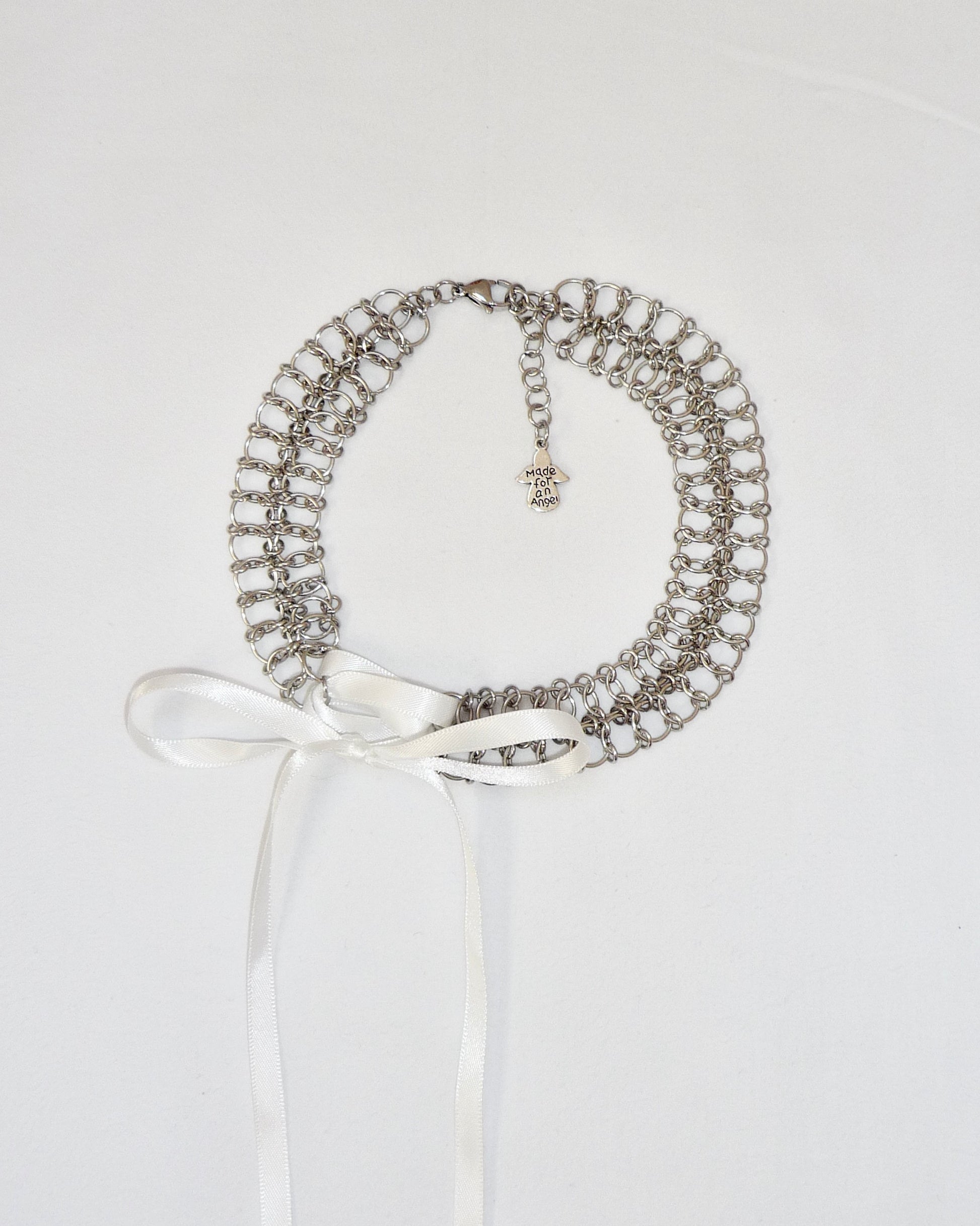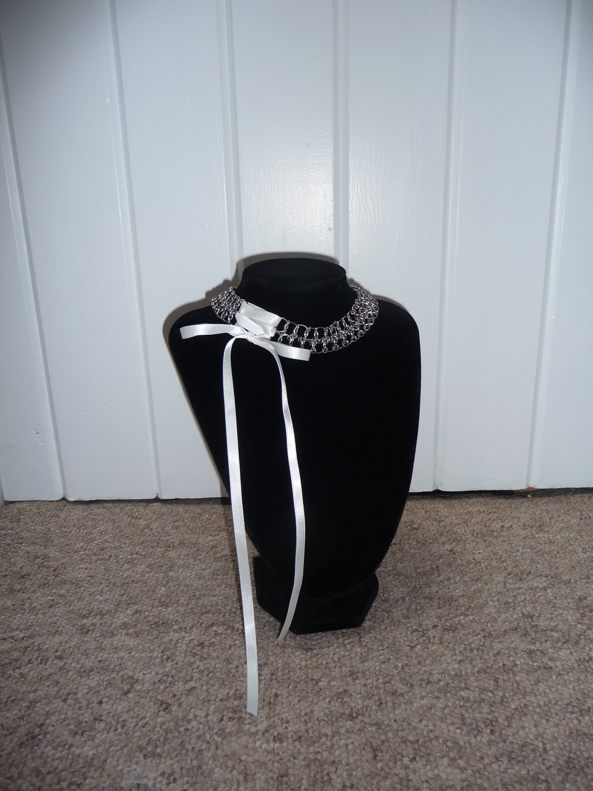 The "Laced" Choker Necklace is handmade using surplus stainless steel jump rings tied together with white satin ribbon. This is a short choker style necklace made of hand-chain mailed double rows.